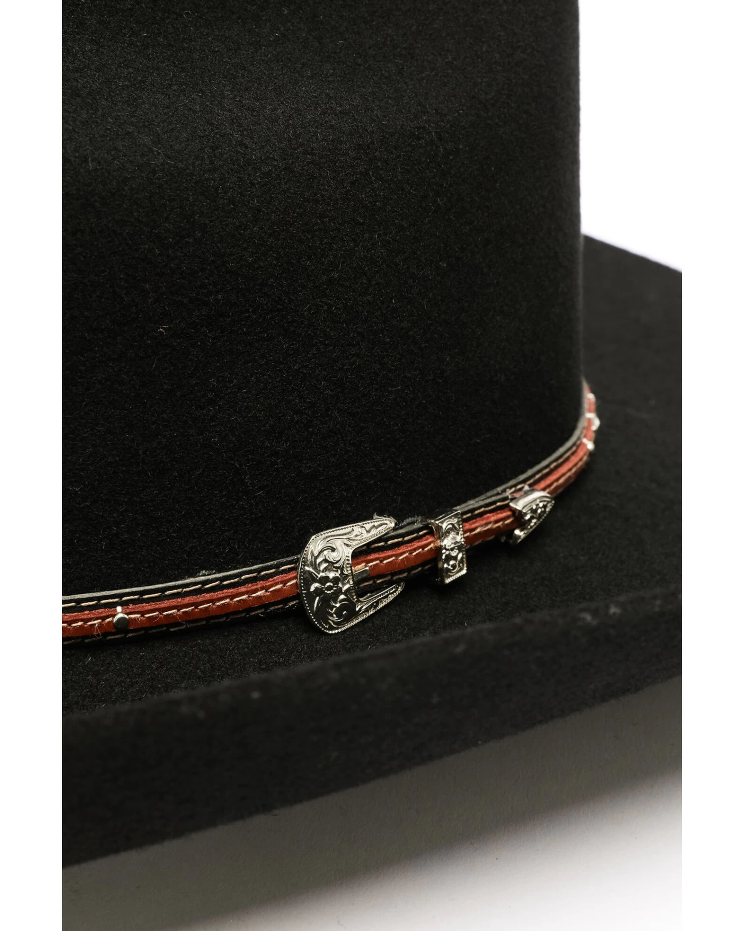- Layered black with brown hat band with contrast topstitching and studded accents